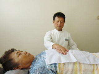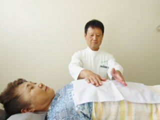 コロナの技法には、疾患部の大きさや深さ、場所によって、平面立ち、カニ立ち、石立ち、コレクト、放射といった手の使い方をします。写真は、胃の治療をしているところです。